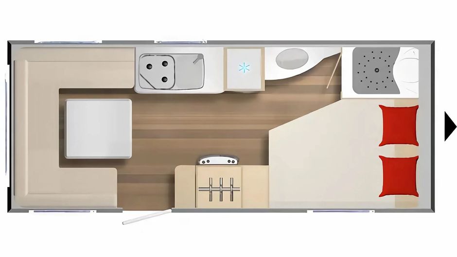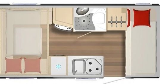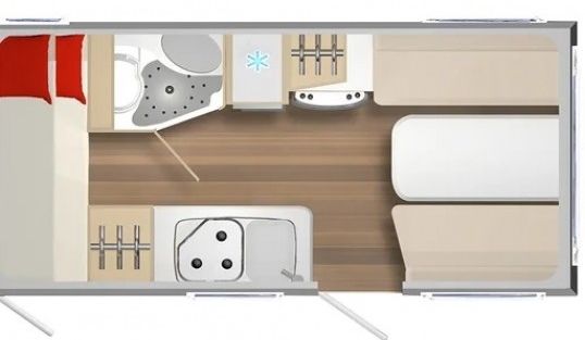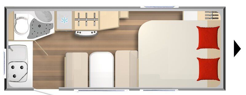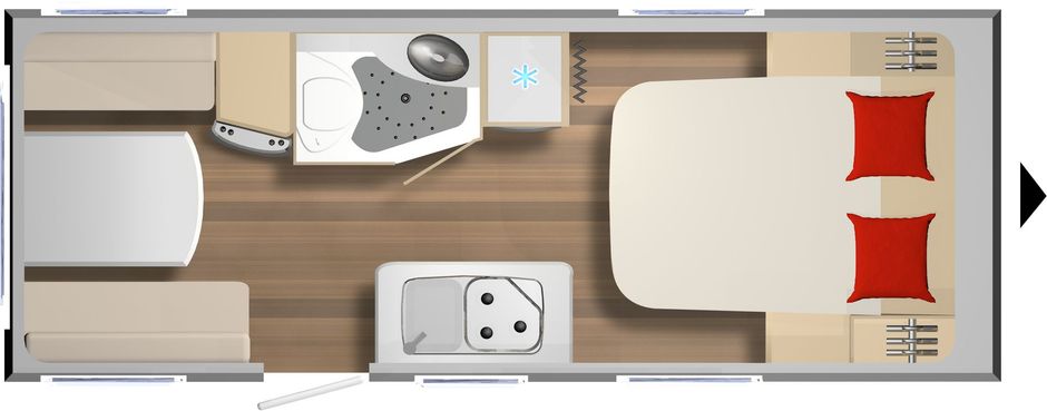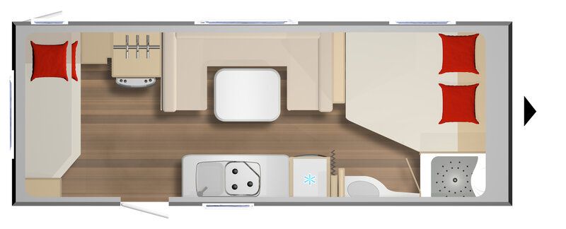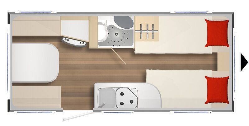 Configurata con letti singoli nella parte anteriore della caravan e grazie al single-twin (optional) si potrà godere di un mega letto matrimoniale. Servizi cucina e vano bagno al centro. Dinette trasformabile a letto nel posteriore.