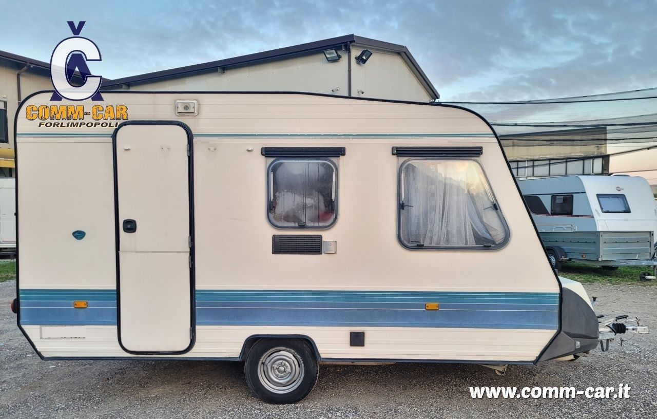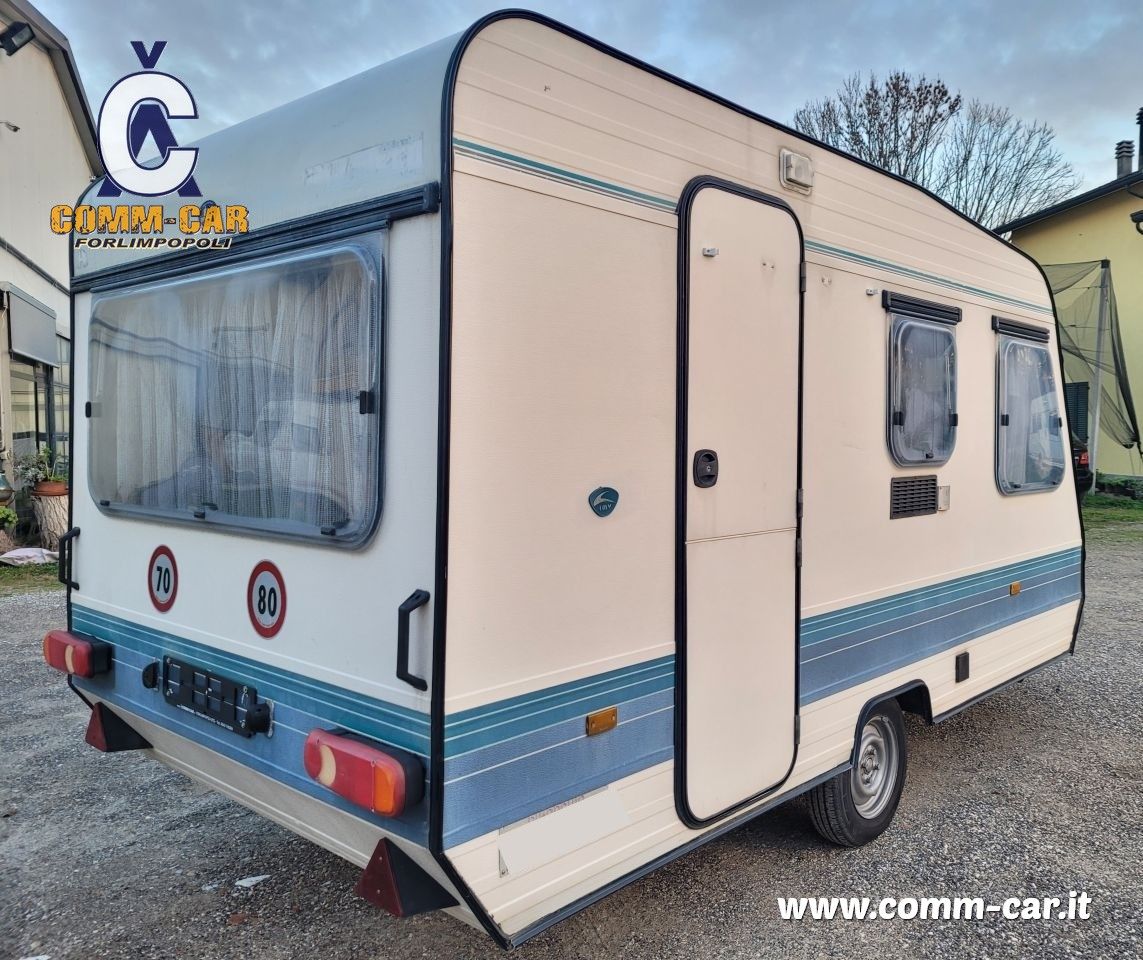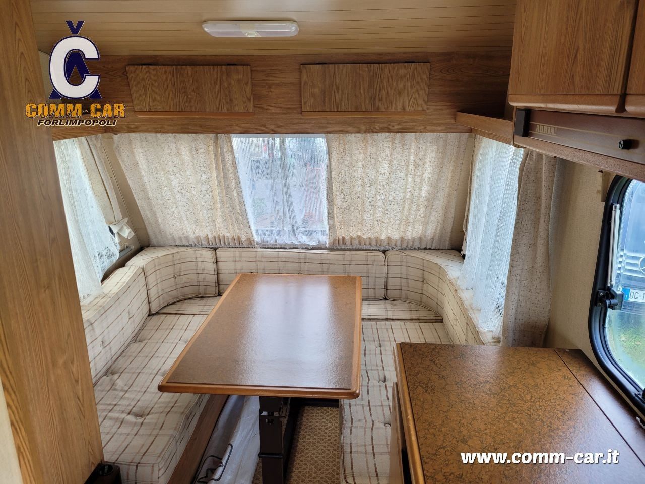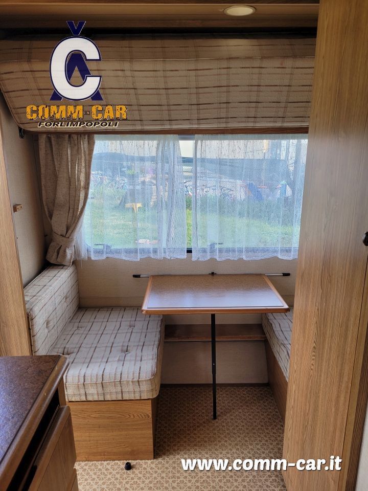 Caravan configurata con dinette circolare anteriore trasformabile in ampio letto matrimoniale, dinette singola trasformabile in letto, piano cottura 2 fuochi con lavello, frigorifero trivalente e